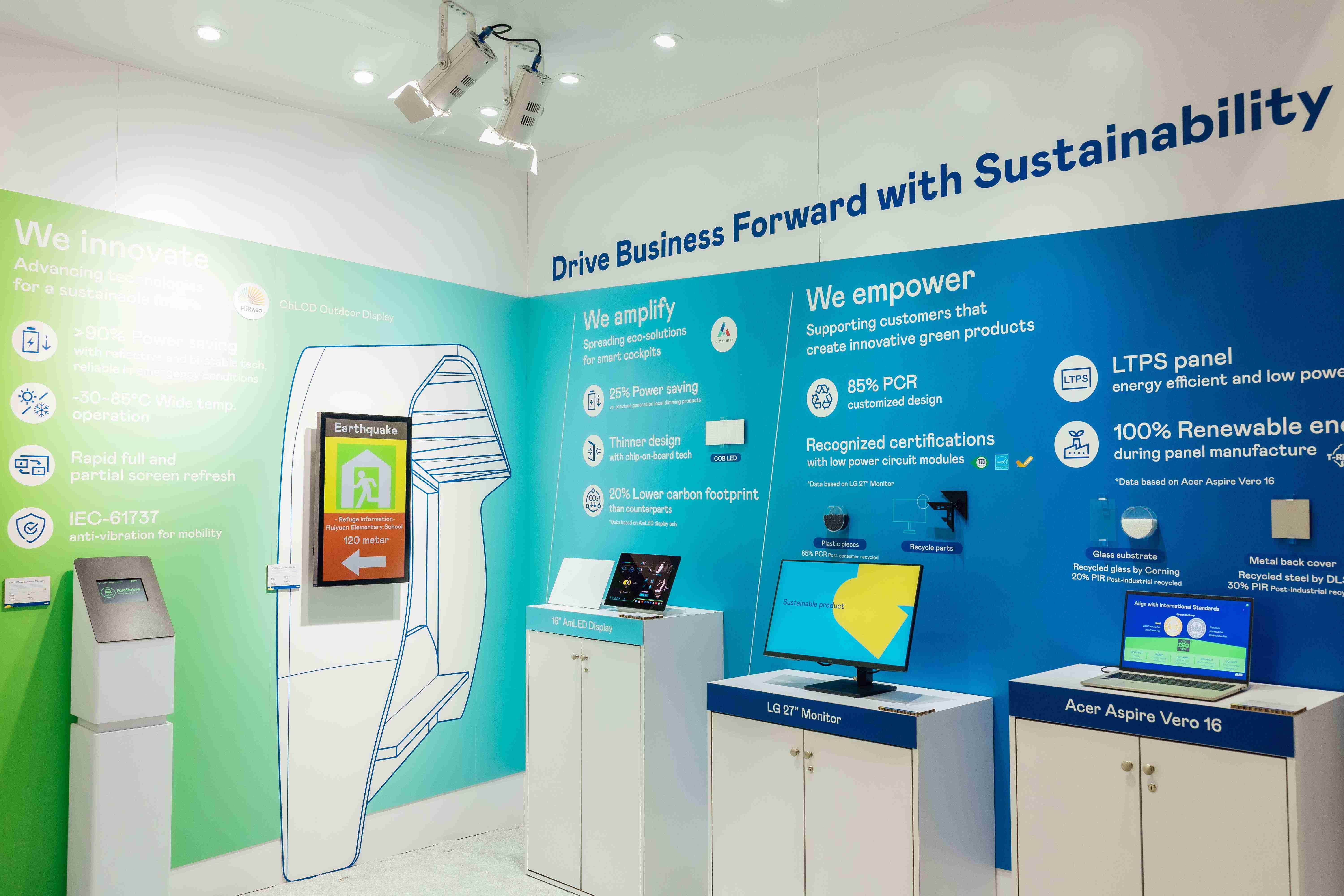 彩运网运用创新显示技术HiRaso胆固醇液晶双稳态技术达到显示零耗能、、、、扩大节能省电的AmLED显示技术应用于车用产品、、、以再生的消费后回收(PCR)塑料及全绿电生产之面板,,应用于笔电及萤幕,,,,增加绿色价值。。。。