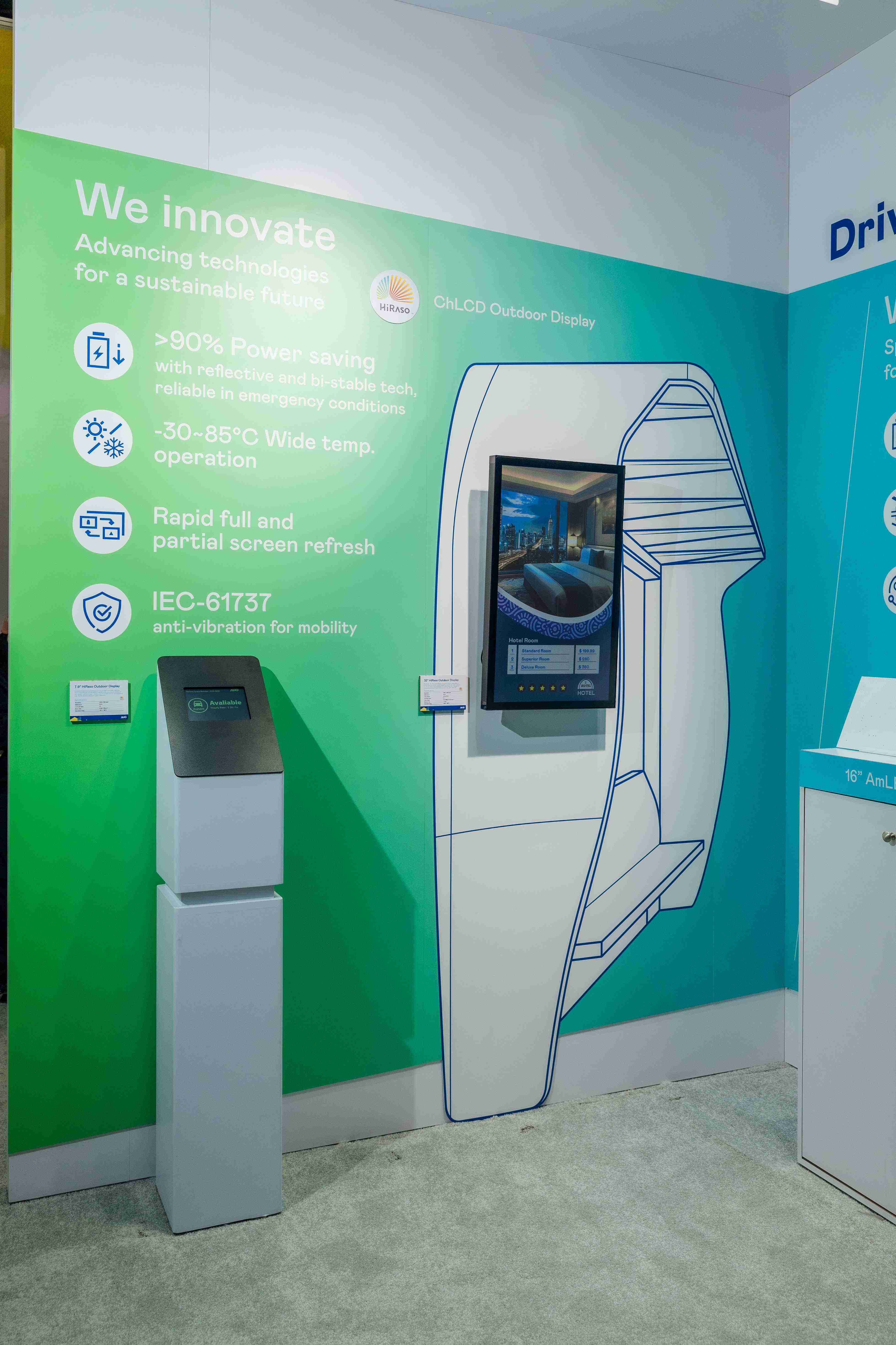 HiRaso胆固醇液晶显示器运用反射环境光线的方式,,,呈现影像显示时零耗能的环保省电诉求,,光线愈强愈能呈现绝佳的色彩饱和度及显示效果,,,,同时在摄氏-30度至85度间宽温的使用优势,,为户外电子看板的新首选。。。。