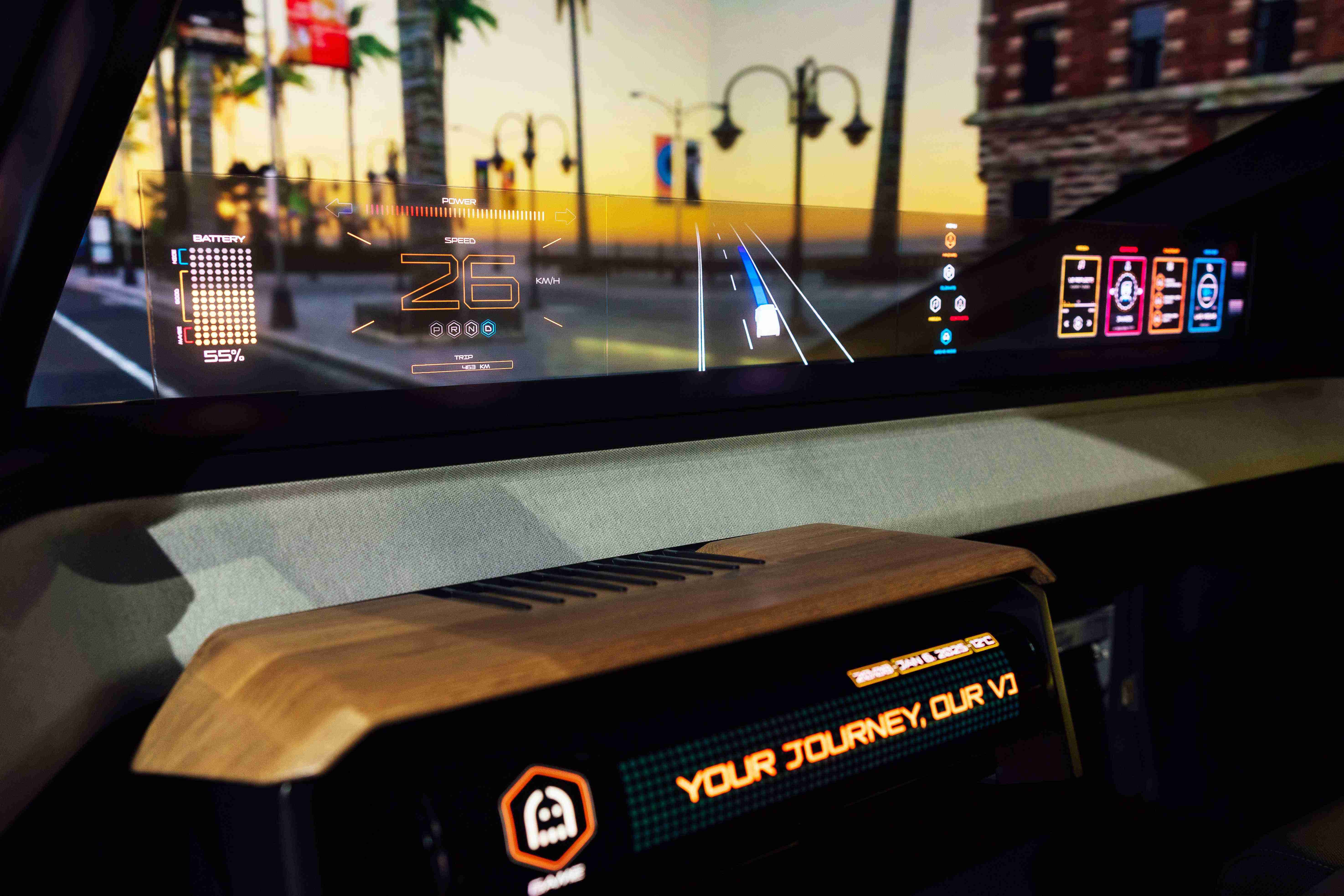 车用运算方案驱动无界透明显示介面(Horizon Image Glass),,整合仪表板、、、、中控及副驾显示功能为一体式全景呈现,,,不仅提供清晰的外部视野,,,,亦能即时显示车辆状态、、、、导航及路况资讯,,,,并赋予个性化设定与驾驶安全警示等加值化服务。。