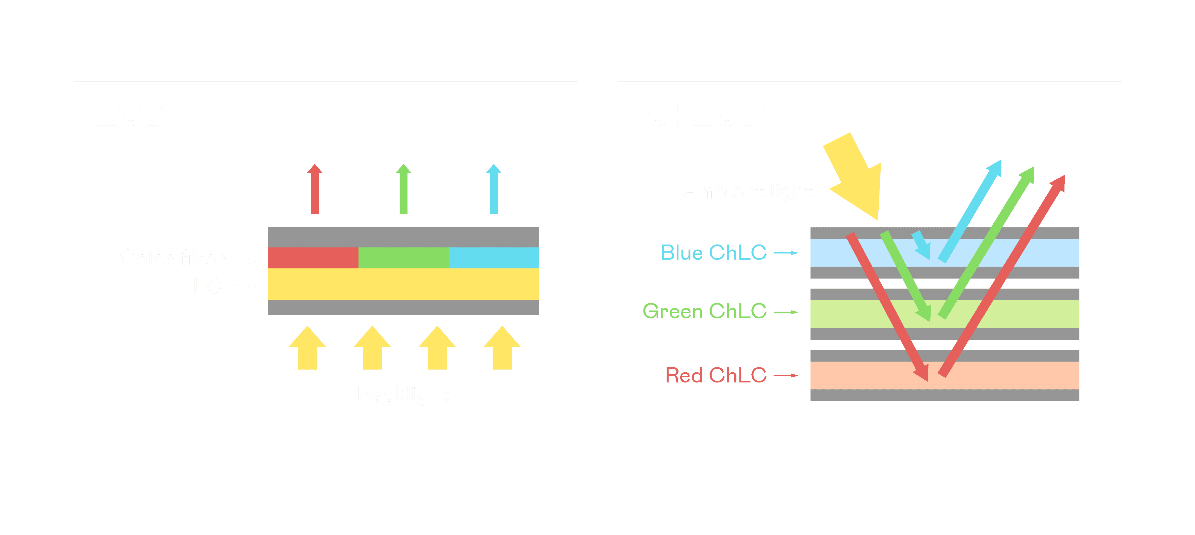 ChLCD 胆固醇液晶就如同纸张一样,,透过反射环境光来显示影像,,因此长时间观看不易造成人眼视觉疲劳,,,,可达到护眼效果。。。。当处于户外阳光下使用,,,LCD 影像容易失真而不易观看,,,但胆固醇液晶仍可维持较佳的影像品质。。。。
