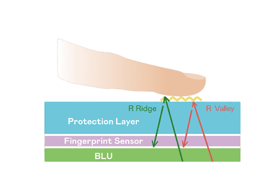 TFT 指纹扫描感测技术利用薄膜电晶体 (TFT) 当作光感测元件,,,,藉由非晶硅 (a-Si) 与低温多晶硅(LTPS)既有光电转换特性对不同波段光源进行吸收,,,,使感测 IC 读取阵列感测元件的光漏电差异,,,,转换成数位灰阶影像。。